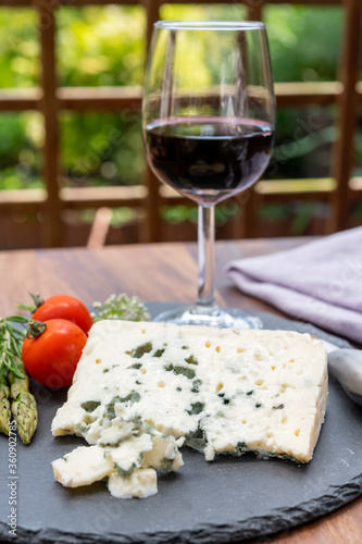 French cheeses collection, piece of roquefort, sheep milk soft blue cheese from Southern France.