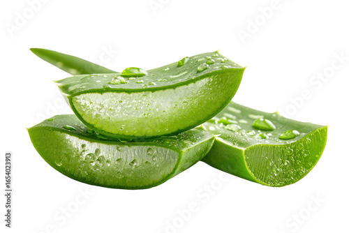 Fresh aloe vera slices, glistening with water droplets