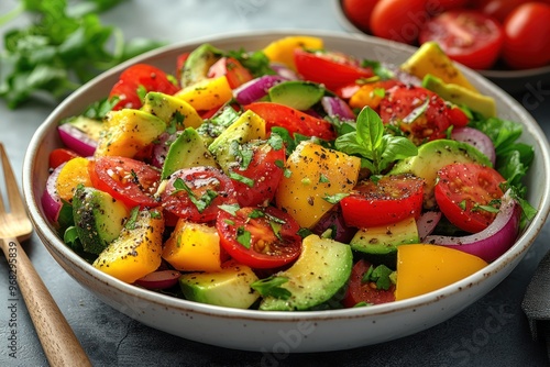 salad, avocado, tomatoes, basil, red, onion, yellow, bell, pepper, green, food, vegetable, fresh, healthy, diet, vegetarian, vegan, summer, lunch, dinner, meal, receipe, tasty, delicious, alimentary, vegetable, side, dish, leaf, appetising, organic, vitamin, mineral, fiber, cookery, eating, breakfast, snack, colours