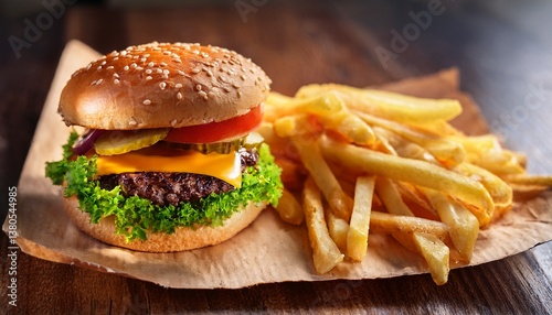 fresh and tasty american homemade hamburger with vegetable and cheese ready to eat and french fries
