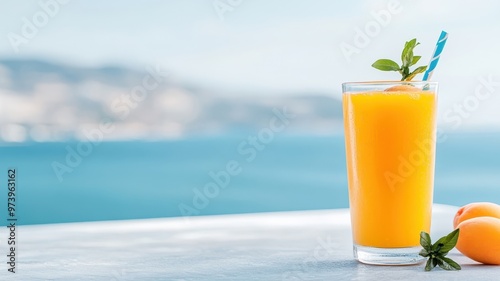 Fresh apricot juiced into a glass, set by the sea for a serene scene.