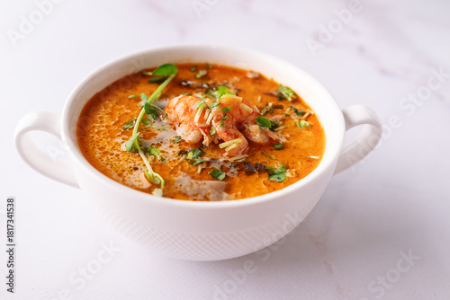 Fresh aromatic hot Thai soup Tom Yum with mushrooms, shrimps and different spices on white marble background close up. Tasty food concept.