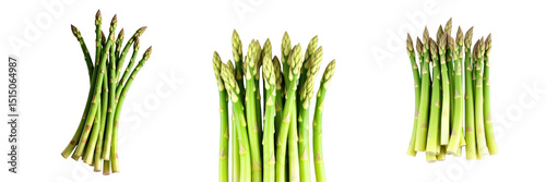 Fresh Asparagus Bunches on transparent Background Featuring Three Distinct Arrangements of Vibrant Green Stalks with Tender Tips Highlighting Their Natural Texture and Color