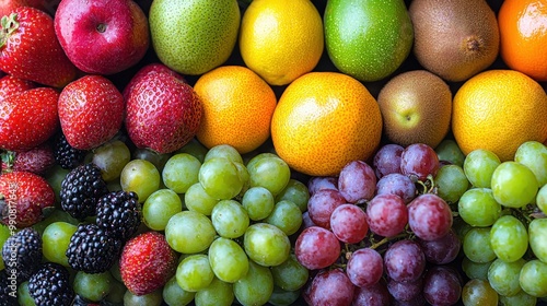 Fresh assorted fruits laid out in vibrant colors, showcasing strawberries, apples, oranges, grapes, and kiwis in an inviting display