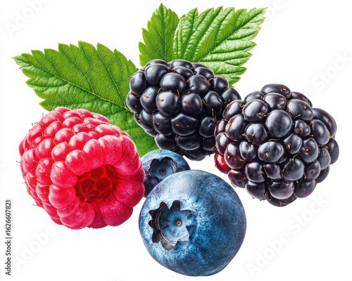 Fresh Assortment of Colorful Berries with Green Leaves on a Bright Background
