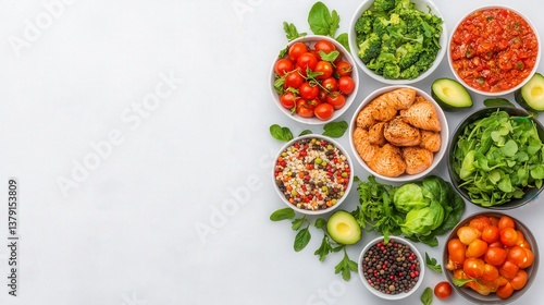 Fresh assortment of vegetables and herbs in bowls, ideal for healthy cooking and meal preparation.