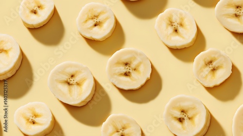 banana, slice, fresh, scattered, pattern, flat, lay, top, down, view, yellow, pale, background, bright, lighting, fruit, healthy, snack, sweet, ripe, natural, organic, food, nourishment, potassium, energy, diet, vegan, vegetarian, breakfast, smoothie, ingredient, receipe, cooking, kitchen, plate, serve, eat, delicious, tropical, farm, harvest, market, grocery, peel, pulp, soft, texture, vitamin