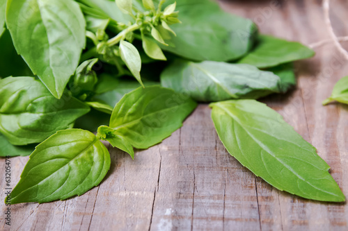 Fresh basil leaves on the wooden background