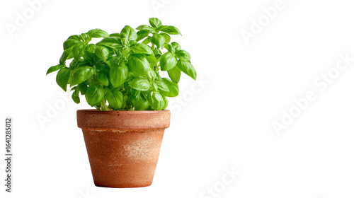 Fresh basil plant in a terracotta pot, bright green leaves, white isolate background.