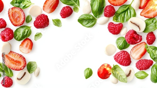 Fresh berries and basil leaves create a vibrant and delicious frame, perfect for food styling and healthy eating visuals.