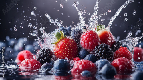 Fresh berries create vibrant splash in water, showcasing strawberries, raspberries, blueberries, and blackberries. dynamic movement and vivid colors evoke sense of freshness and vitality