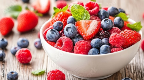 berry, fruit, bowl, fresh, red, blue, food, healthy, delicious, natural, summer, vitamin, sweet, tasty, organic, ripe, juicy, dessert, snack, breakfast, colourful, vibrant, nourishment, diet, plant, nature, garden, farm, green, mint, strawberry, blueberry, raspberry, white, wood, table, photo, still, life, macro, close, up, detail, texture