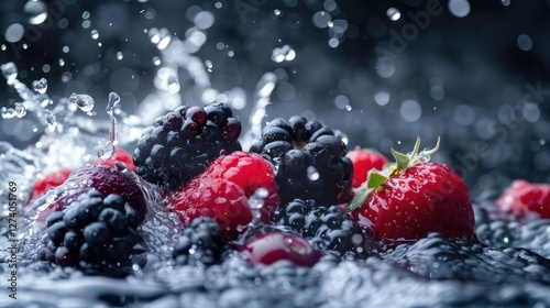 Fresh berries splashing in water, showcasing vibrant colors and textures.