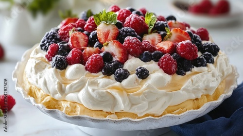 Fresh Berry Pavlova with Cream and Mint Garnish