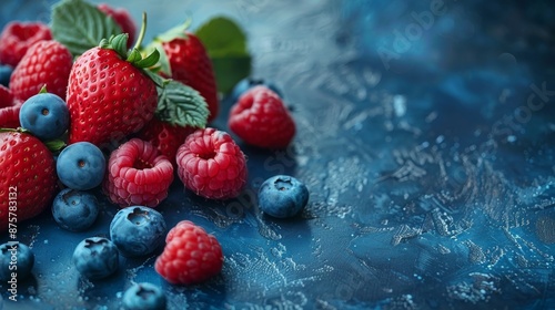 Fresh Blueberries, Strawberries, and Raspberries on Blue Background