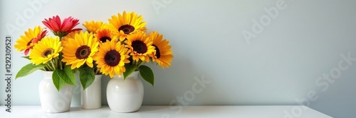 Fresh bouquet of colorful daisies and sunflowers, vases, fresh