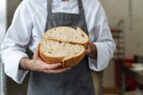 anonymous, apparel, apron, artisan, bake, baked goods, baker, bakery, big, bread, clothing, copy space, cut, food, fresh, hand, human hand, indoor, loaf