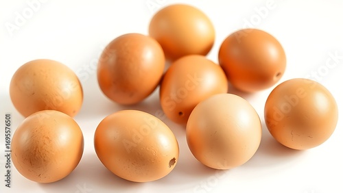 Fresh brown eggs arranged neatly on a white surface, highlighting natural textures.