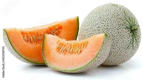 cantaloupe, melon, slice, whole, fruit, cut, seed, ripe, fresh, orange, green, isolated, closeup, studio, white background, still life, food, healthy, nourishment, diet, sweet, juicy, refreshing, vegetarian, vegan, ingredient, tropical, raw, natural, organic, macro, horizontal, nobody, summer, health, vitamin, antioxidant, culinary, cooking, grocery