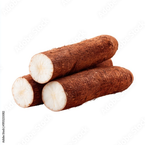 Fresh Cassava Roots Stacked on White Background, Showcasing Natural Texture and Color Variation for Culinary Use and Food Photography