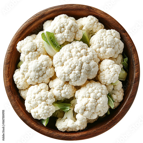 Fresh cauliflower florets in wooden bowl vegetable isolated on transparent background