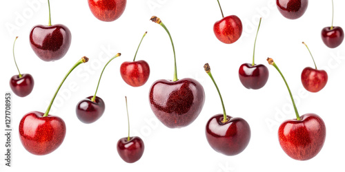Fresh Cherries Floating in the Air, Isolated on Transparent Background Realistic Floating Cherries on Transparent Background for Creative Design
