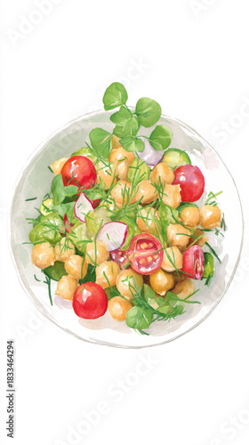 Fresh chickpea salad with cherry tomatoes, herbs, and greens, served on a white plate, isolated on white background