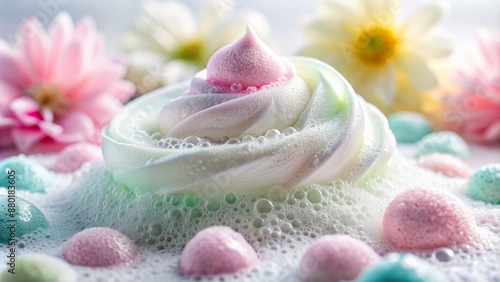 Fresh clean foam on white background, macro shot of luxurious spa treatment for glowing skin, soft focus, pastel colors, serene ambiance.