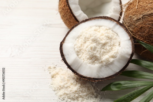 Fresh coconut flour, nuts and palm leaf on wooden table, space for text