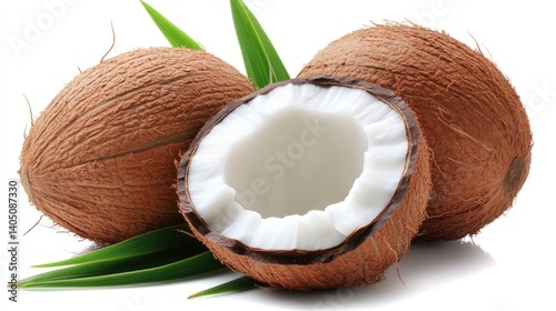 Fresh Coconut with Shell and Green Leaves Isolated on White Background