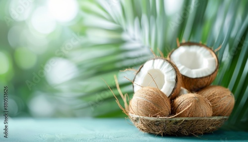 Fresh coconuts in a natural setting with palm leaves. Ideal for tropical themes, organic products, and healthy living concepts.