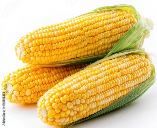 Fresh corn cobs showcasing vibrant yellow kernels arranged artistically against a pristine white background
