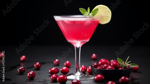 Fresh Cranberry Cocktail. Cocktail with Cranberry with Cranberries on black background. Minimalism. Food photography. Horizontal format
