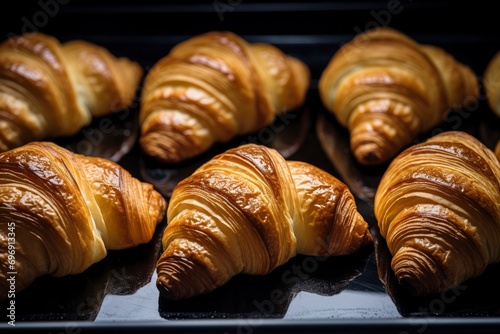 Fresh crispy golden croissants lie on a baking sheet close-up. Sweet pastry made from puff pastry, a classic French dessert. Bakery concept, croissant production