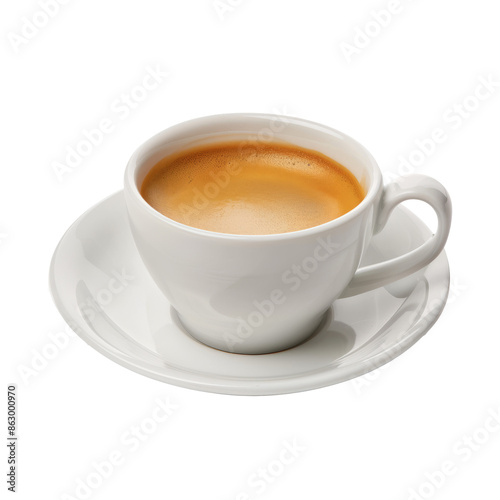 Fresh cup of coffee on white background. Aromatic coffee served in a classic white cup and saucer, perfect for cafe and beverage visuals.