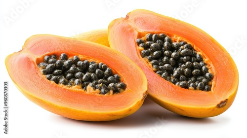 Fresh, export-quality papayas, halved to show the vibrant orange flesh and black seeds, isolated on a white background