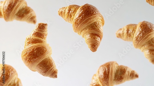 Fresh, flaky croissants suspended in mid-air against a white background.