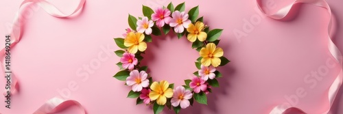Fresh floral Easter wreath, pink wall backdrop, silk ribbon accents, seasonal, Easter