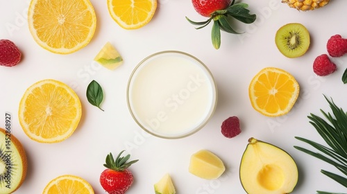 smoothie, ingredient, milk, fruit, healthy, breakfast, food, diet, nourishment, kiwi, strawberry, raspberry, lemon, orange, pineapple, avocado, tropical, vitamin, refreshing, delicious, tasty, summer, drink, beverage, dairy, dessert, snack, topview, overhead, white background, isolated, vegan, vegetarian, organic, natural, fresh, bright, colourful, vibrant, juicy, ripe, healthy lifestyle, wellness, food photography, receipe, cooking