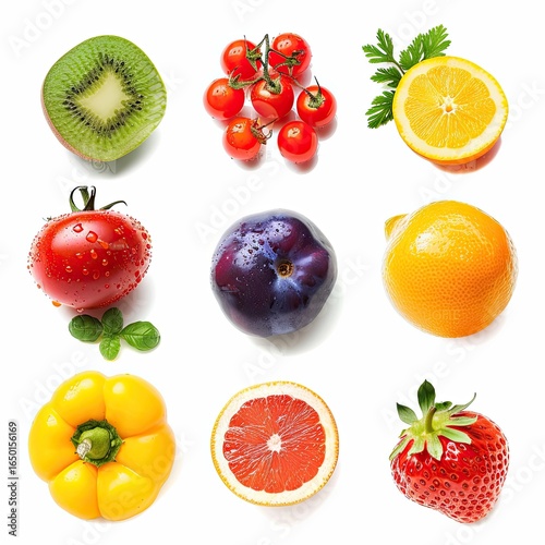 fruit, vegetable, kiwi, tomatoes, cherry, parsley, lemon, plum, grapefruit, strawberry, pepper, healthy, fresh, food, nourishment, produce, natural, vitamin, diet, organic, red, yellow, green, orange, purple, top, view, isolated, sliced, whole, bright, juicy, delicious, colourful, healthy eating, seasonal, ripe, vitamin c, antioxidant, alimentary, diet food, vegan, raw, summer, spring, autumn