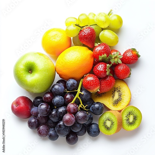 Fresh fruit assortment apple orange strawberries grapes kiwi healthy eating food photography diet 100 character on transparent background