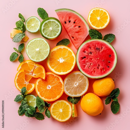 Fresh fruit assortment featuring watermelon, citrus, and mint on a pastel background