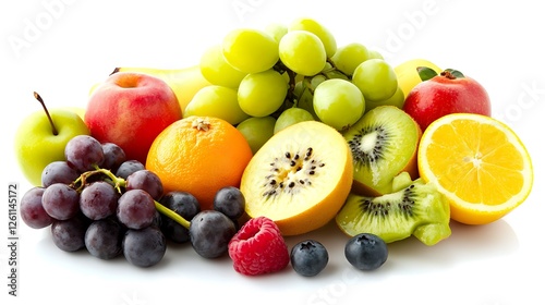 Fresh fruit assortment; healthy eating; white background; vibrant colors; food photography
