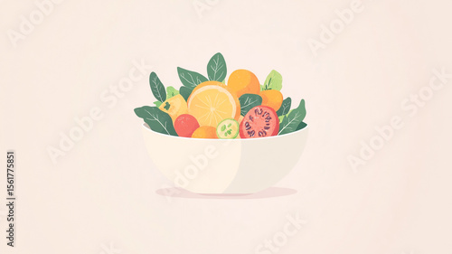 Fresh Fruit Bowl: An artistic arrangement of colorful, fresh fruit and leafy greens in a simple, elegant bowl, perfect for evoking feelings of health and vitality.