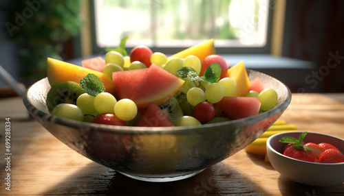 Fresh fruit bowl on wooden table, a healthy summer dessert generated by AI
