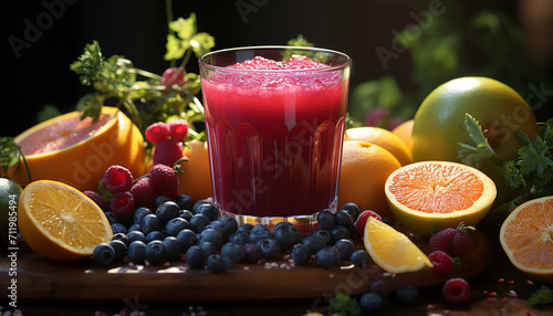 Fresh fruit on a wooden table, a healthy summer cocktail generated by AI