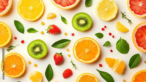 fruit, fresh fruit, citrus fruit, orange, grapefruit, lemon, kiwi, strawberry, leaf, green leaf, white background, food photography, health food, vitamin c, diet, nourishment, vegan, vegetarian, summer, spring, tropical, refreshing, juicy, tasty, delicious, nature, pattern, background, texture, design, still life
