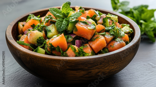 fruit, salad, mint, wooden bowl, healthy, fresh, colourful, diced, cucumber, melon, herb, ingredient, summer, snack, vegetarian, organic, bowl, garnish, refreshing, sweet, chopped, vibrant, cookery, meal, side dish, natural, green, orange, red, preparation