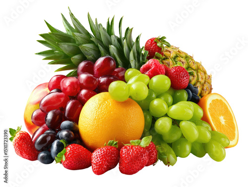 Fresh Fruit Still Life: A vibrant still life featuring an array of ripe pineapple, grapes, strawberries, orange, capturing the natural beauty and freshness of summer's harvest.