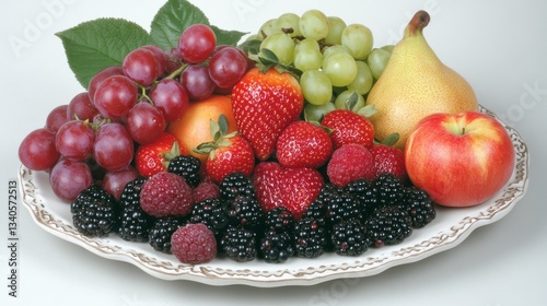 Fresh fruits and berries arranged on a white plate, showcasing natural vibrancy and simplicity.